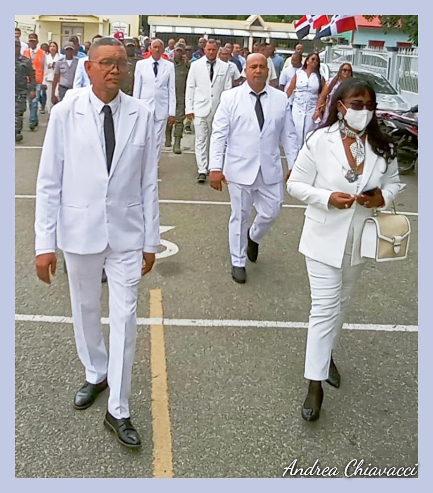 El alcalde Enércido (Guaro) Metz, la vicealcaldesa y los regidores(as) desfilan en el acto de toma de posesión de sus puestos en el ayuntamiento perteneciente a la provincia Montecristi. (Foto: Andrea Chiavacci).