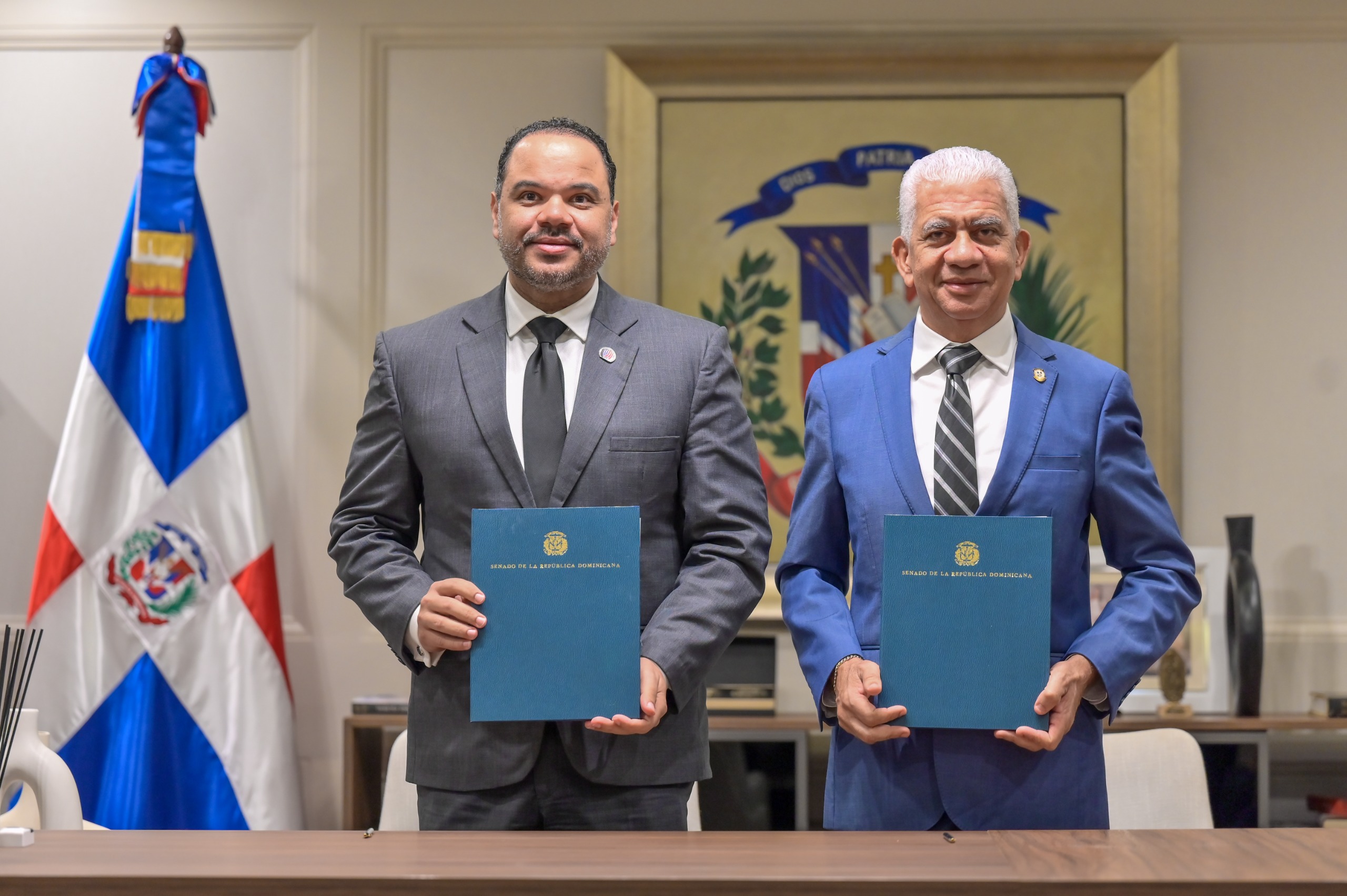 El presidente del Senado, Ricardo de los Santos y el titular del Defensor del Pueblo, Pablo Ulloa, plasmaron sus rubricas durante un acto realizado en el despacho presidencial del órgano legislativo.