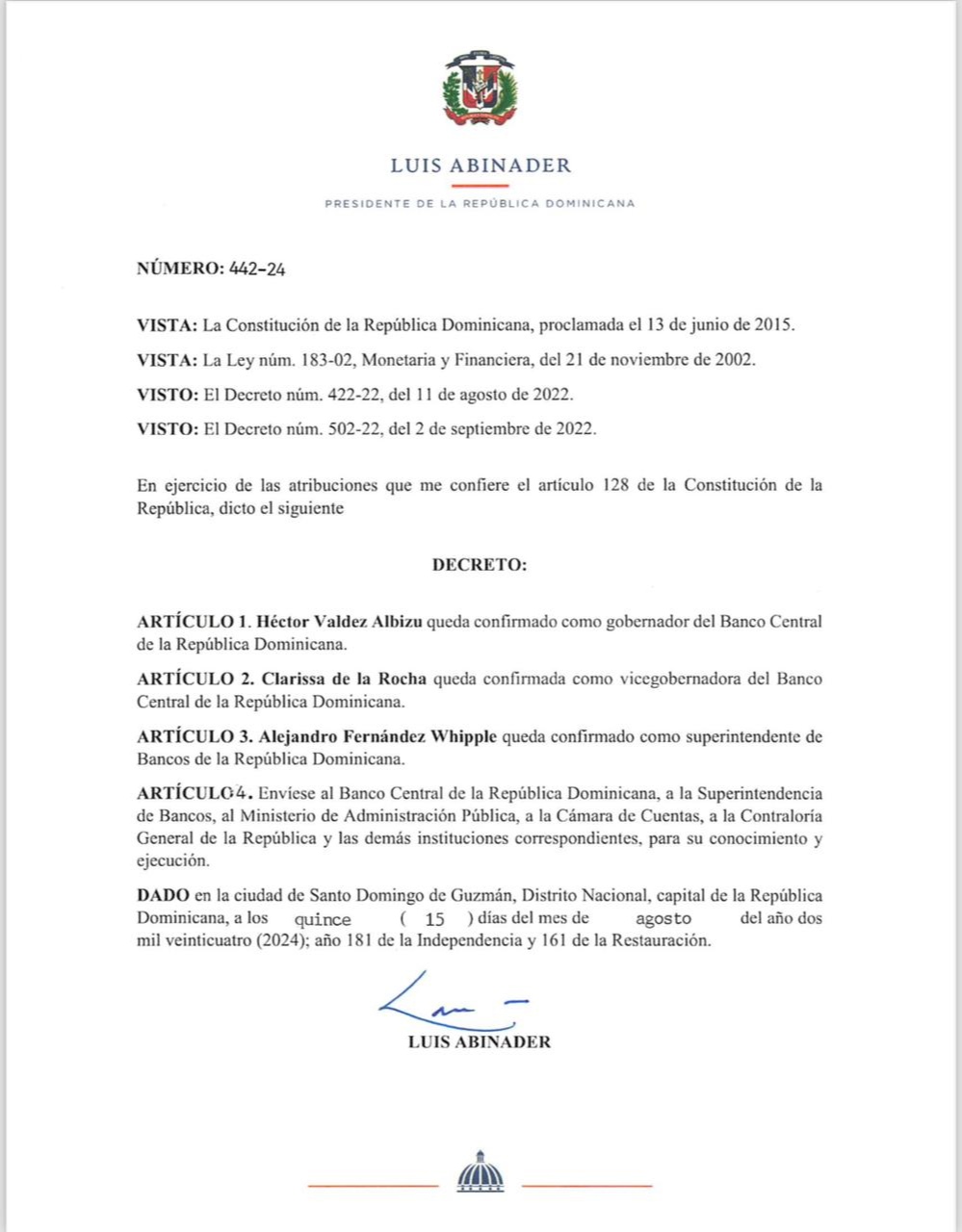 Santo Domingo- El Presidente de la República, Luis Abinader, ha emitido el Decreto 442-24, mediante el cual se confirman importantes designaciones en el sector financiero del país, asegurando la continuidad y estabilidad de las instituciones clave del sistema bancario dominicano.