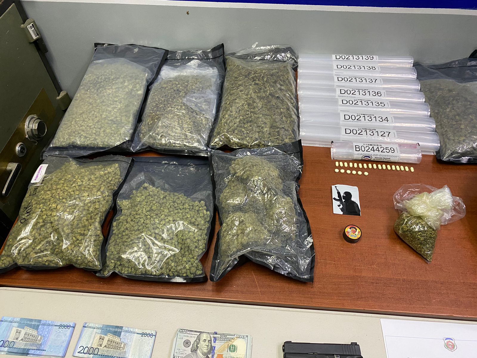 En la segunda habitación, se confiscaron RD $ 154, 200 pesos dominicanos, US $ 5, 065 dólares estadounidenses, una pistola marca Glock, con su cargador y varias cápsulas, una trituradora, una selladora, una balanza, fundas plásticas y 04 celulares. Además quedó en poder de las autoridades una jeepeta marca Changan, color blanco, placa G-618404.