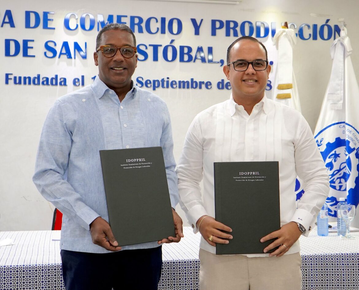 San Cristóbal– El Instituto Dominicano de Prevención y Protección de Riesgos Laborales (IDOPPRIL) y la Cámara de Comercio y Producción de San Cristóbal suscribiendo un convenio para desarrollar acciones conjuntas orientadas a promover la seguridad ocupacional en las empresas de esta provincia.