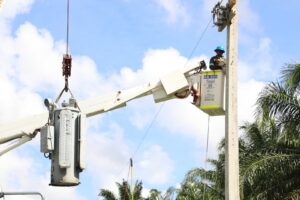 Chirino, Monte Plata. – Con el objetivo de mejorar la calidad del voltaje y garantizar un servicio eléctrico más estable y eficiente, la Empresa Distribuidora de Electricidad del Este (Edeeste) informa sobre la instalación de tres nuevos reguladores de 114 KVA en la red monofásica del circuito MP6901, en el Distrito Municipal de Chirino, provincia Monte Plata.