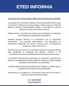 La ETED exhorta a la población a mantenerse informada solo por canales oficiales mientras se termina de estabilizar el sistema.