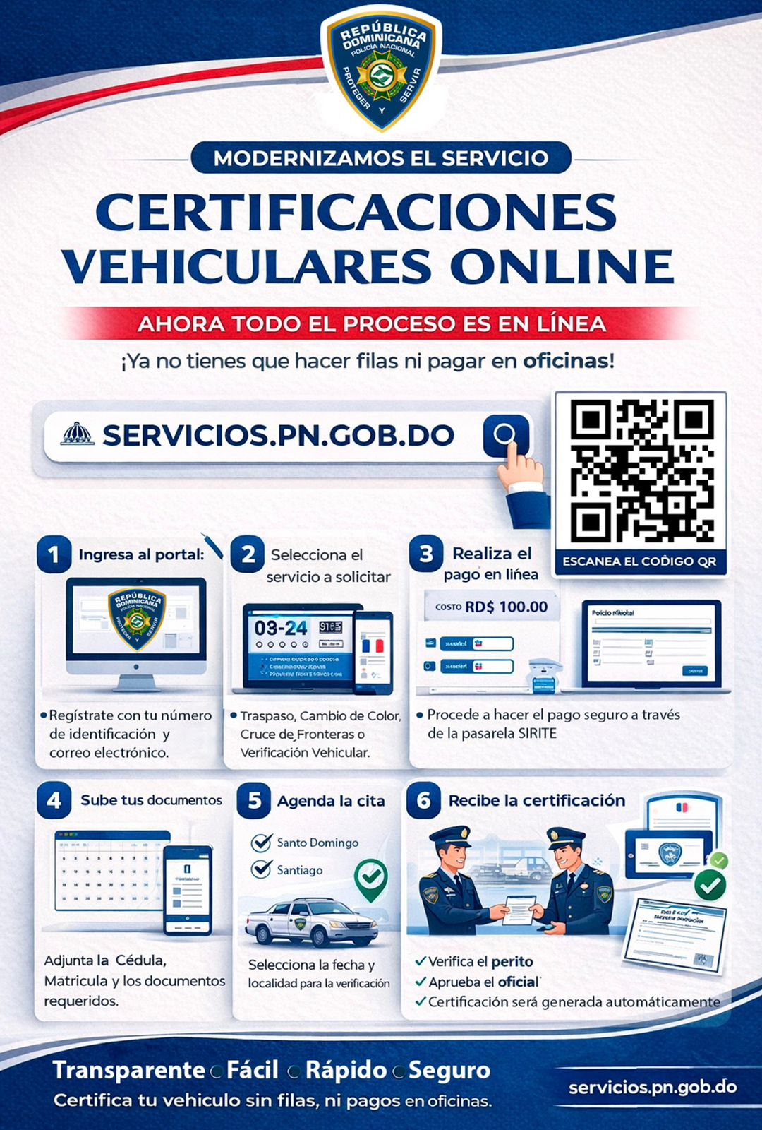 La Policía Nacional pone en marcha su nueva plataforma tecnológica para certificación de vehículos en línea, los ciudadanos podrán gestionar sus certificaciones vehiculares de manera completamente digital, eliminando la necesidad de acudir presencialmente a oficinas a realizar pagos físicos y depositar documentos.