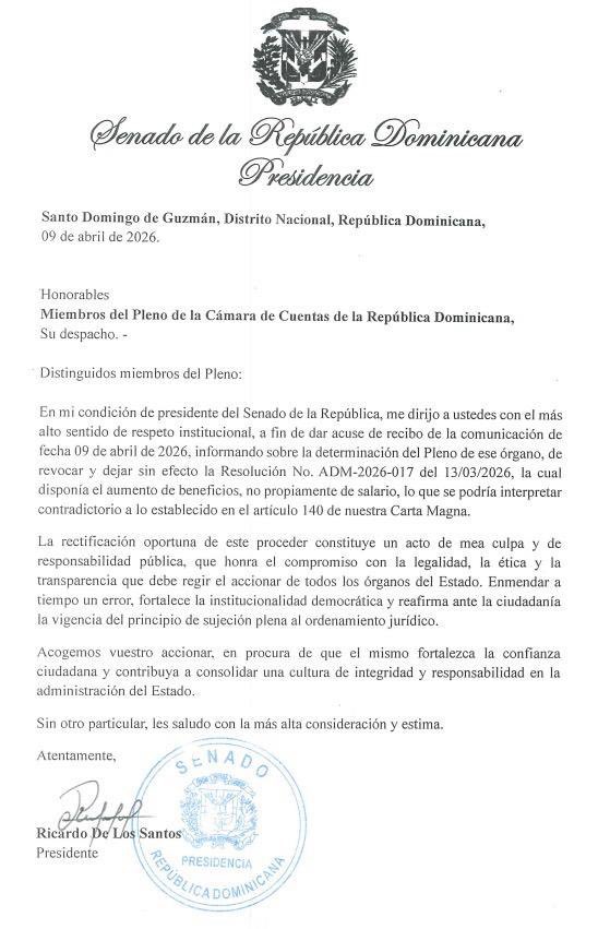 El presidente del Senado, Ricardo de los Santos, mediante una carta enviada este 9 de abril, valoró positivamente que la Cámara de Cuentas admitiera la falta. Según el legislador, este paso "honra el compromiso con la legalidad y la transparencia" y busca evitar una crisis de confianza ante la ciudadanía.