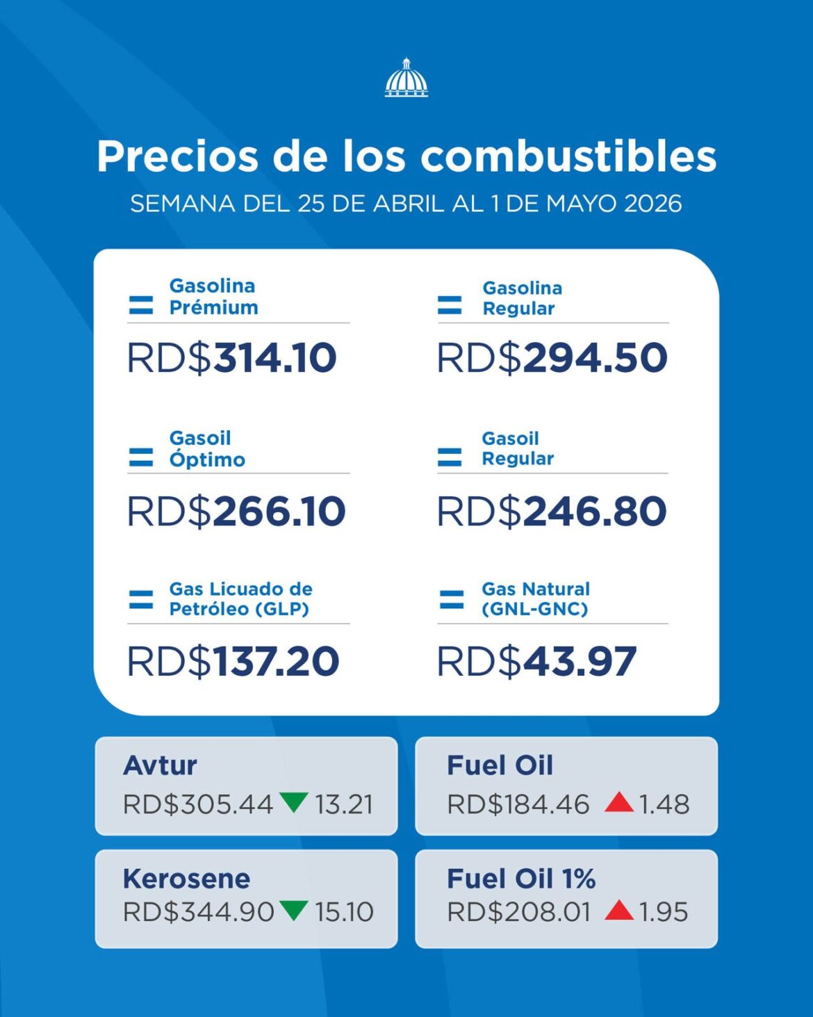 Santo Domingo, D.N. – A pesar de la permanencia del conflicto en el Medio Oriente y su efecto en los precios internacionales del petróleo y sus derivados, el Ministerio de Industria, Comercio y Mipymes (MICM) informó que el Gobierno dominicano, mediante un subsidio de RD$1,143.9 millones, mantendrá congelados los cinco combustibles de mayor consumo, y dispone reducciones en otros por segunda semana consecutiva para la semana del 25 de abril al primero de mayo de 2026.